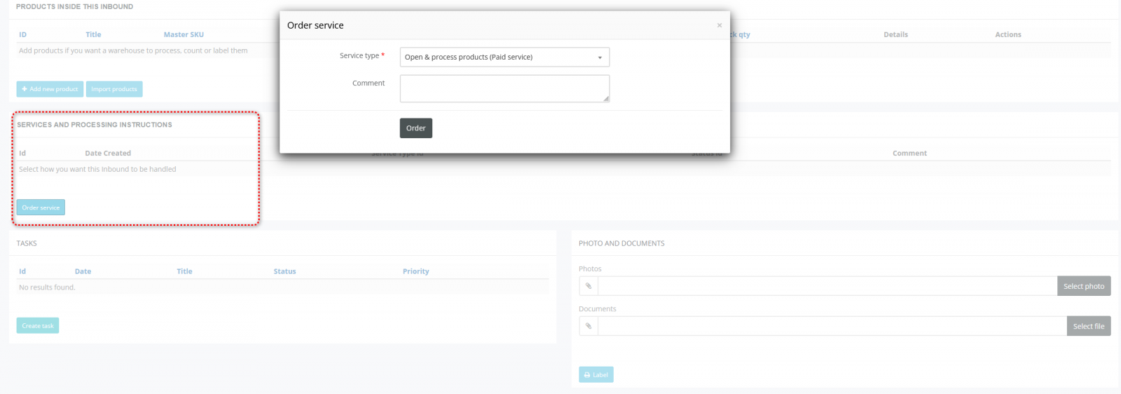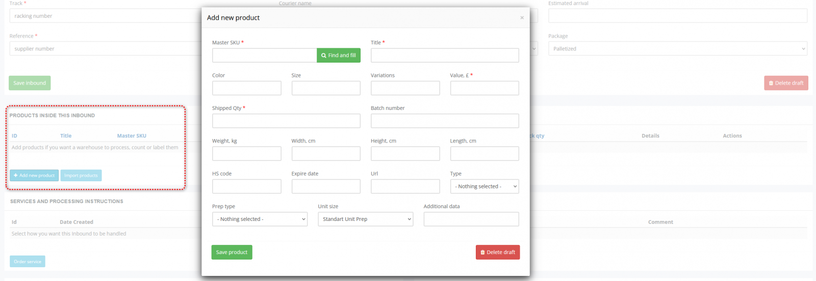 Why this matters: Services define what actions the warehouse team must perform and what will be billed. Clear service selection prevents misunderstandings and delays.