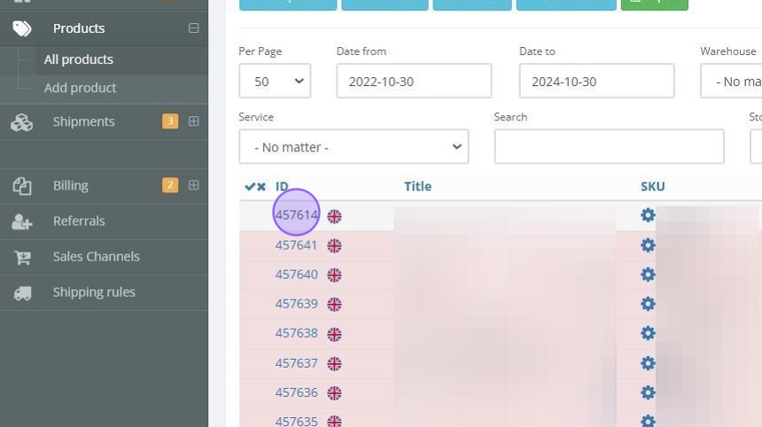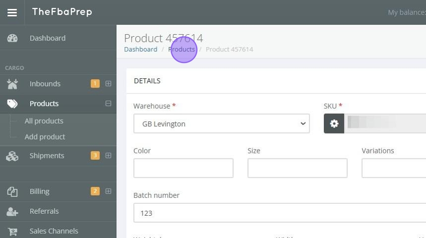 Tip: The products page displays key details about each product, such as the title, SKU number or ID, SKU value, shipped quantity, received quantity, status, and the current in-stock quantity.